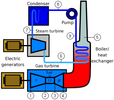 The figure shows the scheme of a simplest ideal combined (binary) cycle, i.e. steam turbine (6-7) cycle with use of superheated water steam. At this plant the boiler (6-9) burner is replaced with gas turbine unit (Brayton cycle: 1-4) equipped with air compressor (1-2), combustion chamber (2-3), gas turbine (3-4) and one more electric generator.