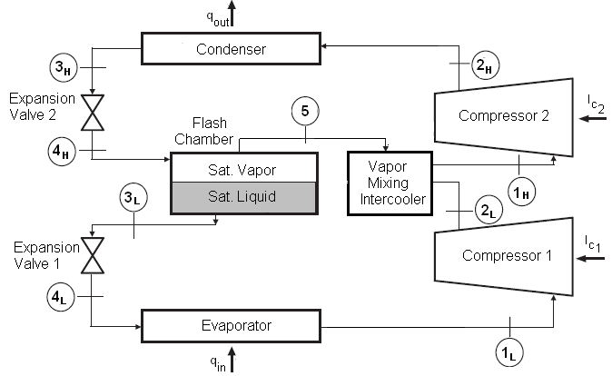 In the event that a high COP of a refrigeration cycle is of greater importance compared to other factors, it is possible to significantly increase the COP of a basic cycle through the use of a multistage vapor compression cycle. This is especially true when the pressure ratio between the heat rejection and heat absorption pressures is large 5 or more. Multistaging involves one or more intermediate pressures between the heat rejection and heat absorption pressures, and a series of compressors operating between successive pressure intervals. One type of multi-compressor vapor compression cycle includes a mixing chamber where saturated vapor from the flash chamber mixes with the vapor leaving the low pressure stage compressor. This vapor-mixing chamber acts as a regenerative intercooler since it cools the superheated vapor leaving the low-pressure stage compressor using lower temperature saturated workin fluid, mixing the two prior to the next stage of compression.
