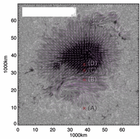 The image shows a sunspot approximately 50,000 kilometres in diameter. The umbra (darkest area) is approximately 15,000 kilometres in diameter. The coloured arrows indicate the magnetic vectors. The letters A, B, C, and D refer to the spectra in the following image.