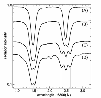 The depressions on the right indicate the iron line at 630.25 nanometres. The distance between the two Zeeman wavelenths at the umbra (D) is approximately 28 Ångstroms. Therefore, the line spread is approximately 14 Ångstroms.