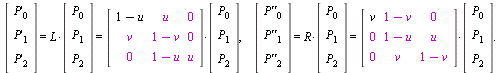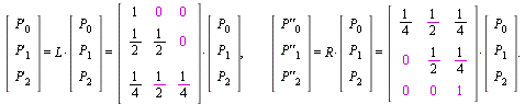 Dependency between points P[0], P[1], P[2]  and  (diff(P(x), x))[0], (diff(P(x), x))[1], (diff(P(x), x))[2]  and `P  can be represented, using subdivision matrices L and R, in the following form: