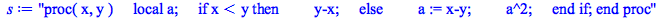 | > | f := proc(x,y) local a; if x < y then y-x else a := x-y; a^2 end if end proc; |