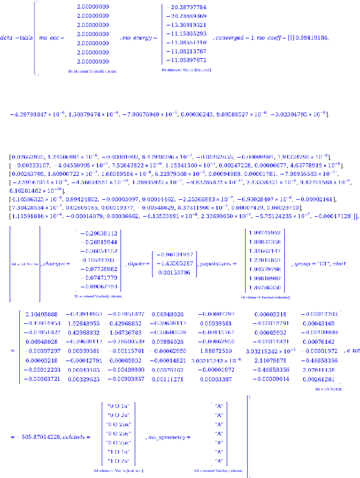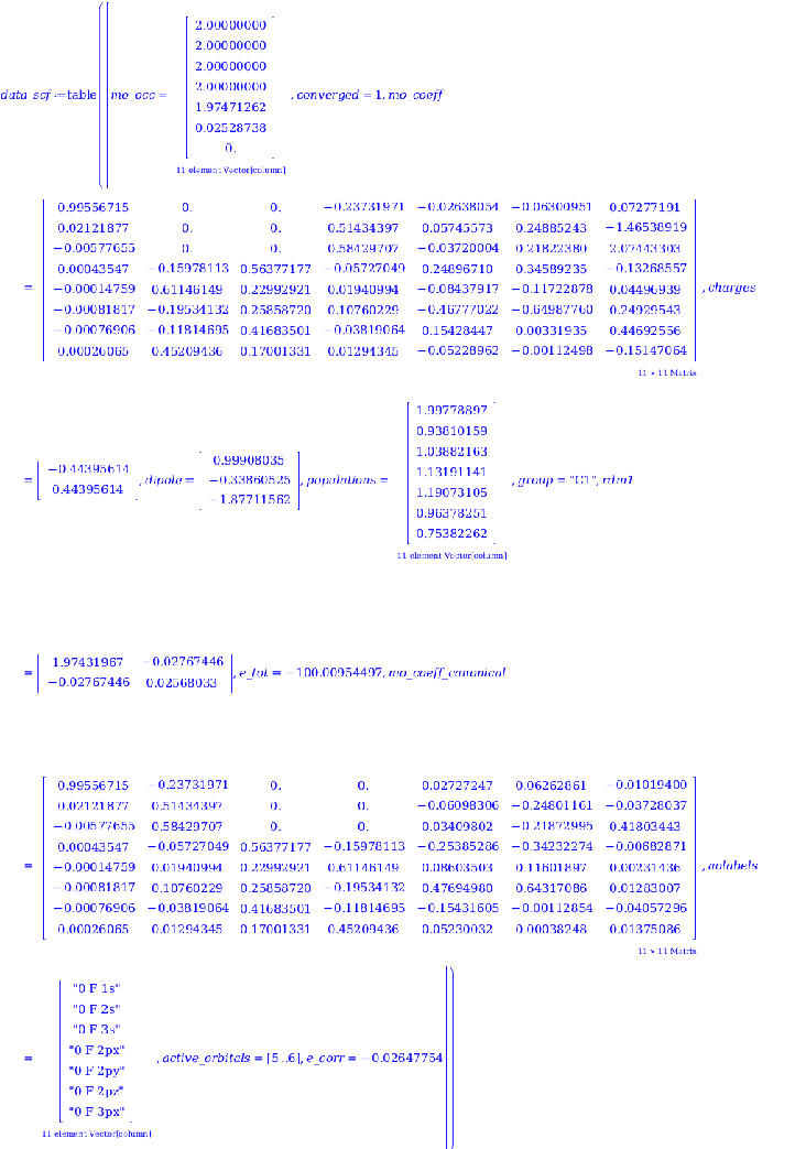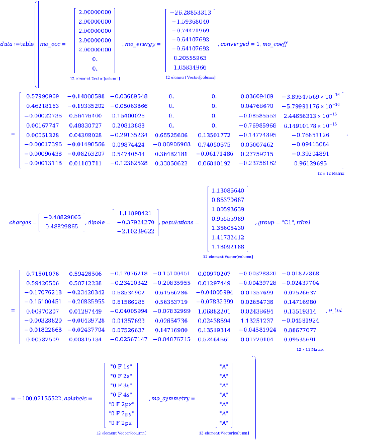 datatablemo_occ=2.000000002.000000002.000000002.000000002.000000000.,mo_energy=−25.90202575−1.46443647−0.57855098−0.46350983−0.463509830.60611202,converged=1,mo_coeff=0.99472636−0.25006317−0.080042140.0.0.082375940.022413950.942406830.420890820.0.−0.533733510.001294540.03851262−0.324652140.868850620.17265435−0.38040816−0.00043874−0.013052580.11003011−0.111020480.981297780.12892677−0.00243224−0.072359190.609970560.48246559−0.085118370.71472739−0.005522130.15381697−0.528650890.0.1.06902327,charges=−0.199913070.19991307,dipole=0.58797708−0.19927539−1.10471692,populations=1.999090641.946540421.839455071.981559061.433267890.80008693,group=C1,rdm1=2.11683774−0.494108980.03528596−0.01195901−0.06629679−0.00328525−0.494108982.13156421−0.200639060.067999980.37696940−0.155339830.03528596−0.200639061.783189680.073480690.407352670.35508878−0.011959010.067999980.073480691.97509615−0.13805872−0.12034560−0.066296790.376969400.40735267−0.138058721.23464808−0.66715625−0.00328525−0.155339830.35508878−0.12034560−0.667156250.60632385,e_tot=−98.57249547,aolabels=0 F 1s0 F 2s0 F 2px0 F 2py0 F 2pz1 H 1s,mo_symmetry=AAAAAA