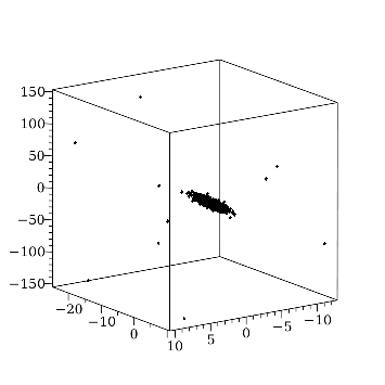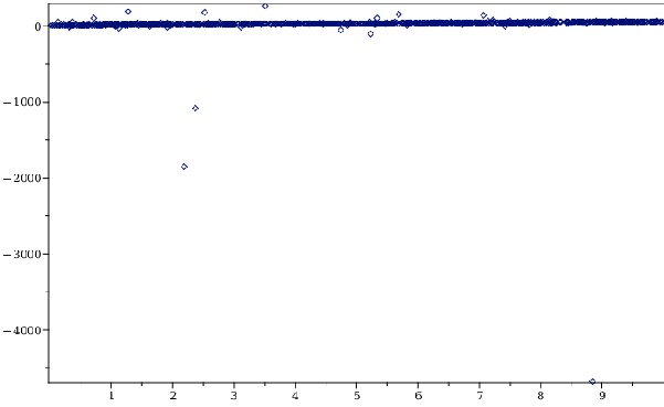 In the next example, we have 1000 input points with two independent variables, most of which follow the model z=5x3y+2+noise, where the noise is relatively small. However, 10 of the points are far away in both the dependent and independent directions (and they have much greater noise). Such cases are particularly hard for non-robust methods to deal with.