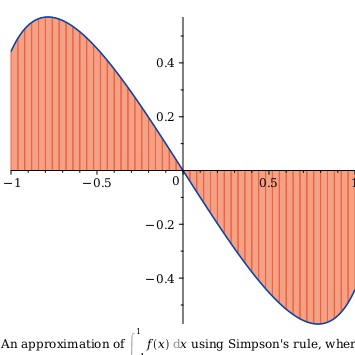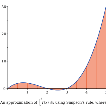 The ApproximateInt(f(x), x = a..b, method = simpson, opts) command approximates the integral of f(x) from a to b by using Simpson's rule. The first two arguments (function expression and range) can be replaced by a definite integral.
