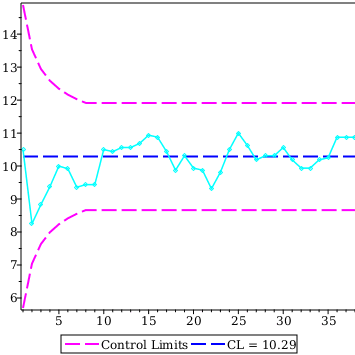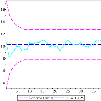 controllimits=deduce or [realcons, realcons] -- This option specifies the values for the control limits. The first element is the value of the lower control limit. The second element is the value of the upper control limit. For data with variable sample size, the value of this option must be a list of control limits for each sample. If this option is set to deduce (the default value), the control limits are computed based on the data.