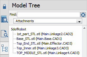 The Attachments view of the Model Tree displays the files attached to your model. Examples of attachments include worksheets, spreadsheets, and CAD drawings. The model tree in Attachments view is organized according to the name of the attachment.