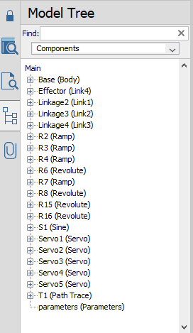 The Components view of the Model Tree displays the components and subsystems in your model in a hierarchical tree view organized by Name.
