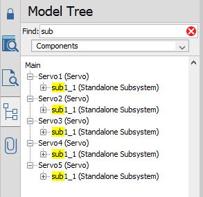 The model tree automatically updates to show the components and subsystems that have names that contain your search term. Matches are highlighted in yellow. Also, if a match is nested in a node, the node is automatically expanded.