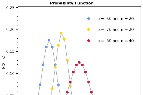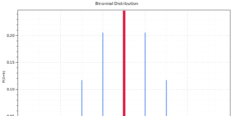 See how the probability function of the binomial distribution changes with different values for the number of successes k, number of trials n, and the probability of success p.