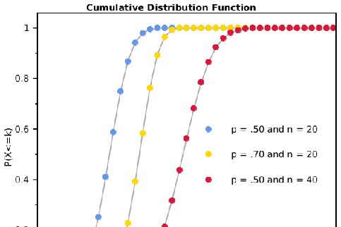 Note that the probability function and cumulative distribution function for the binomial distribution are only defined for integer values for k and as such, there is no continual curve which can be drawn through the point.  The gray lines are only for illustrating the shape of each function over the interval.