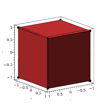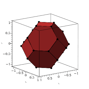 The Tetrahedron, Cube, Octahedron, TruncatedTetrahedron, TruncatedOctahedron, and Cuboctahedron commands create polyhedral sets in three dimensions.  The calling sequence with no arguments, SetName(), uses the default coordinates for the set's ambient space.  Alternatively, the coordinates can be specified via SetName(coords) or generated as indexed variables with variable varname as their root via SetName(varname).