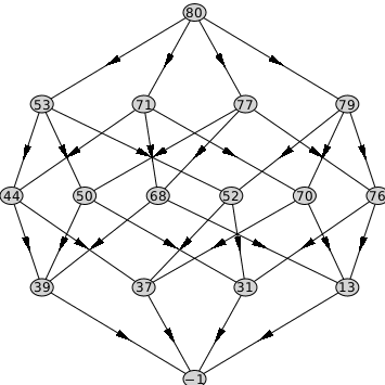 The graph is organized into rows, where each row contains faces of polyset that have the same dimension.  The top row contains only polyset itself, followed by its facets below, etc.  The nodes are labelled with an identification number that can be used to retrieve that face using PolyhedralSets[Faces] through the faceid option.