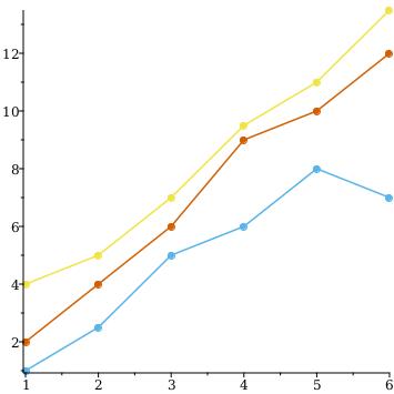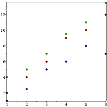 2-D point plots: The first calling sequence plots a single collection of x-values against one or more collections of y-values. Alternatively, the first argument Xr can be a range a..b, indicating that the x-values are equally distributed over this range.
