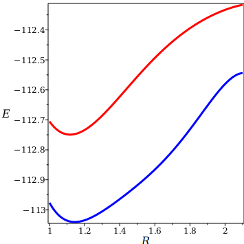 p_hf  plotpes_hf&comma; R&equals;1.0..2.1&comma; axes&equals;boxed&comma; labels&equals;&apos;R&apos;&comma;&apos;E&apos;&comma; color&equals;red&comma; thickness&equals;3&colon; p_mp2  plotpes_mp2&comma; R&equals;1.0..2.1&comma; axes&equals;boxed&comma; labels&equals;&apos;R&apos;&comma;&apos;E&apos;&comma; color&equals;blue&comma; thickness&equals;3&colon;plots:-displayp_hf&comma;p_mp2&semi;