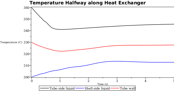 p1sol:-plotTt,x= 0.5 L,t=0..5,axes=boxed,color=black,legend=Tube-side liquid:p2sol:-plotTs,x=0.5 L,t=0..5,axes=boxed,color=blue,legend=Shell-side liquid:p3sol:-plotTw,x=0.5 L,t=0..5,axes=boxed,color=red,legend=Tube wall: plotsdisplayp1,p2,p3,labels=Time (s),Temperature (C),title=Temperature Halfway along Heat Exchanger,titlefont=Helvetica, 18,Bold