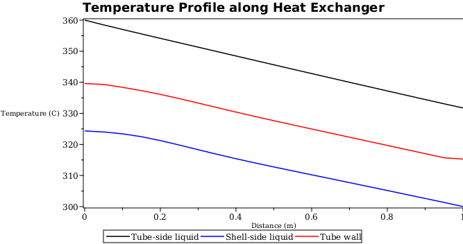 p1sol:-plotTt,t=5,x=0..L,axes=boxed,color=black,legend=Tube-side liquid:p2sol:-plotTs,t=5,x=0..L,axes=boxed,color=blue,legend=Shell-side liquid:p3sol:-plotTw,t=5,x=0..L,axes=boxed,color=red,legend=Tube wall:plotsdisplayp1,p2,p3,labels=Distance (m),Temperature (C),title=Temperature Profile along Heat Exchanger,titlefont=Helvetica, 18,Bold