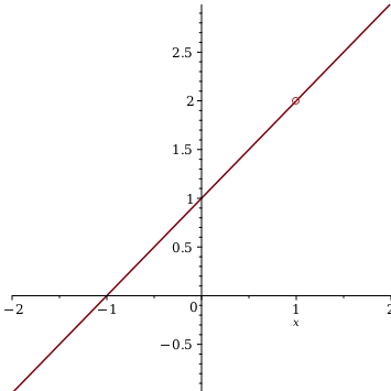 Usually, removable discontinuities are ignored. However, if the showremovable suboption is provided, then a circle is drawn on the plot to mark the point of discontinuity.