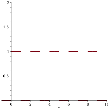plotceilsinπx,x=1..10,discont=usefdiscont=bins=35,view=1..10,0..2,thickness=2