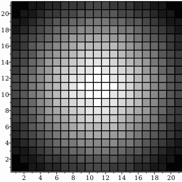 The listdensityplot creates a density plot of the given grid of data. The data may be input as a list of lists of real numbers, or a matrix of real numbers.  In a density plot, the color of each cell depicts the numerical value of the cell.  By default, each cell is assigned a gray level from black (smallest value) to white (the largest value) as the value of the cell increases.