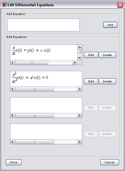 This area is used to add a new equation to the existing system. Enter the ODE in the input area, and click the Add button. The input equation is checked for validity and syntax at this point, and if valid, it is placed in the Edit Equations area below.