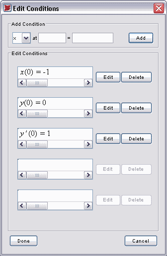 This area is used to add a new condition (initial or boundary) to the existing system. The Add Condition area has a drop-down box for selecting the dependent variable or derivative, and an area for entering the point at which the condition should be applied and the value at that point. When clicking the Add button, the condition is checked for validity and syntax, and if valid, it is placed in the Edit Conditions area below.