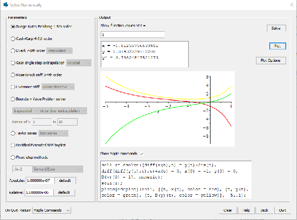 The Output area provides solution values at a point (which can be changed as desired), to display a plot of the solution (options can be changed in the Plot Options window), and also displays the relevant Maple commands needed to accomplish these tasks (making this useful as a learning tool).