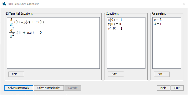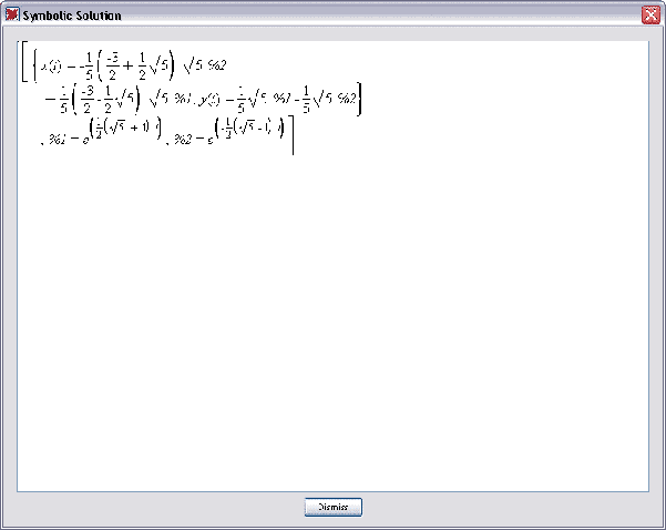To solve the given system numerically or symbolically, click the Solve Numerically or Solve Symbolically buttons respectively. The option specification window for the numeric or symbolic solutions opens.