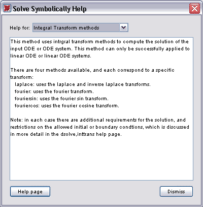 For more information on method-specific options and submethods, click the Help button. The Help Navigator window opens. Also, refer to relevant help pages, specifically, dsolve, dsolve,system, dsolve,inttrans, dsolve,series, and dsolve,formal_series.