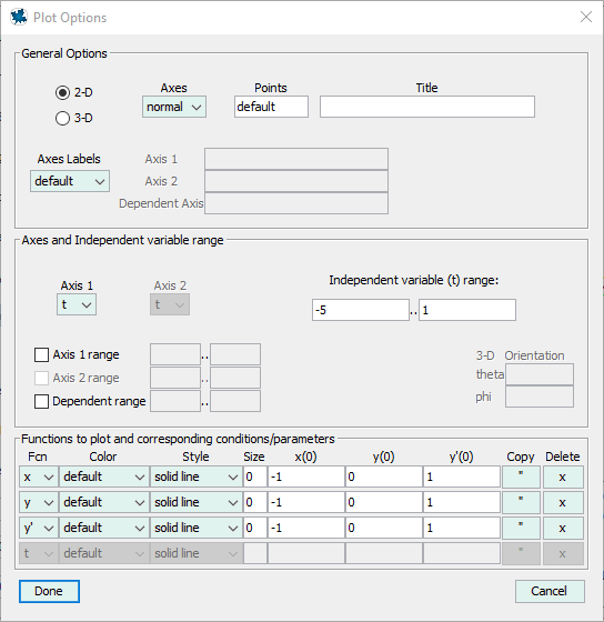 Example To adjust the plot settings to show plots of xt, yt, and yt in the example used here, the independent variable range was set to -5..1 and under Functions to plot, click the button under Copy to add two more curves, and specify their functions as y and y.