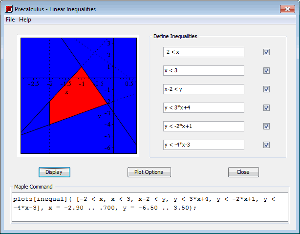 The Linear Inequalities tutor shows the feasible region for a set of linear inequalities. It can be accessed via the Context Panel applied to a sequence, list, or set of up to six linear inequalities. It can also be launched by the LinearInequalitiesTutor command with argument either a set or list of no more than six linear inequalities. Figure 10 shows the default content of this tutor, the feasible region for six linear inequalities. Clearing the check box beside an inequality removes it from the set whose feasible region is graphed when the Display button is pressed.