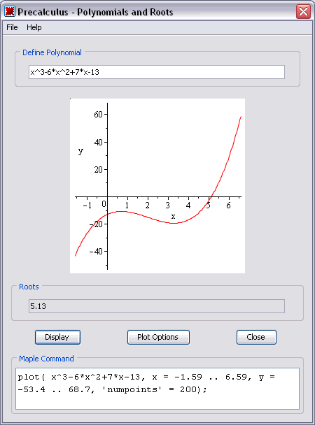 The real zeros and graph of a polynomial are provided by the Polynomial tutor, which can be launched by any of the methods in Table 2. Figure 12 shows the Polynomial tutor applied to x3−6 x2+7 x−13. When the real zeros are not simple integers, the tutor reverts to floats to express them. They (the x-intercepts on the graph) are displayed in the box labeled "Roots". To access the Tutor from Context Panel, from the Context Panel for the equation select Student Precalculus > Tutors > Polynomials.