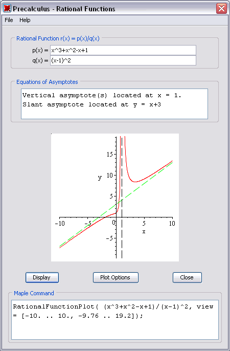 Note: As shown at the bottom of the tutor, the graph is drawn with the RationalFunctionPlot command. For more information on this command and its options, see RationalFunctionPlot.