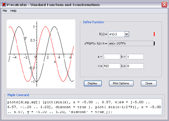 Figure 15 The Standard Functions Tutor applied to sinx, (in red), with the black curve curve corresponding to a horizontal shift of sinx