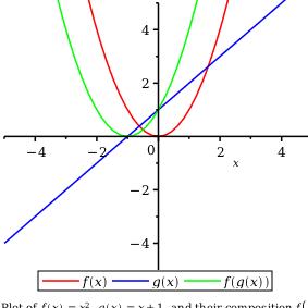 As per the indicated color-coding, the graph shows fx=x2 in red, gx=x+1 in black, gfx=x2+1 in green, and fgx=x+12 in blue.