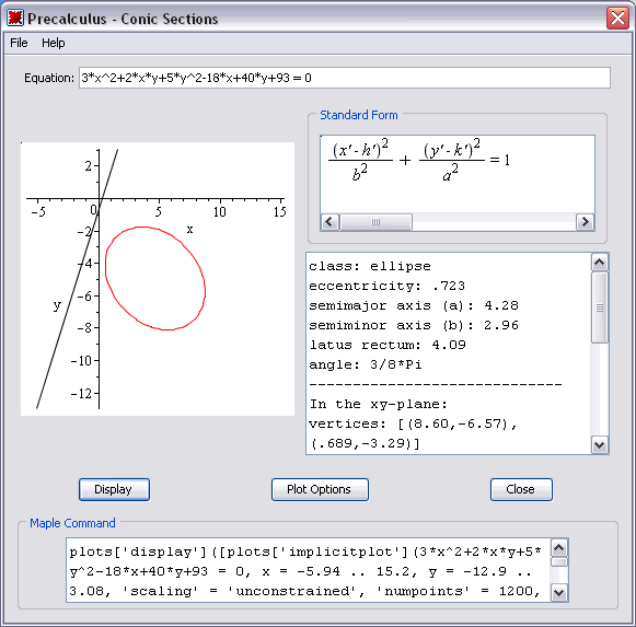The Conic Sections tutor will analyze and graph the conic section determined by its associated quadratic equation. The equation can be given in Cartesian coordinates (using x and y) or in polar coordinates using r=gt or gt,where gt=constant or gt=ab+c dt, with dt either sint or cost. In Cartesian coordinates, the quadratic can have an xy-term, which rotates the conic.