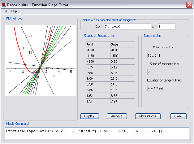 Figure 6 is created with the FunctionSlopePlot command, as per the display at the bottom of the tutor shown in Figure 5. This command defaults to an animation. Click on the graph to access the animation toolbar, with which the animation of the secant line with intersections at x=a ±5/2k,k=0,…,4,can be activated.