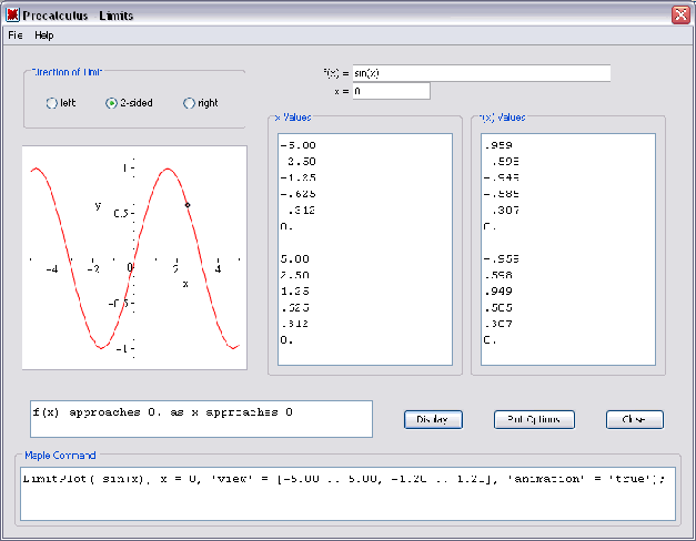 Figure 7 shows the use of this tutor. The graph in the tutor defaults to an animation in which a point moves along the curve according to the values listed in the tables to its right. If the x-coordinate of the point at which the limit is being investigated is x=a, then the neighboring points at which the function is sampled are a ±52k,k=0,…,4.