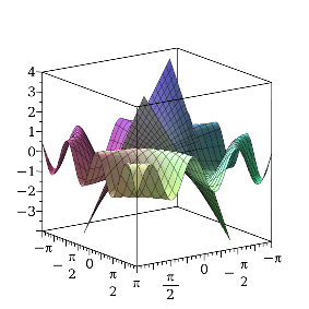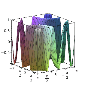 A≔plot3dsinx⋅y,x=−Pi..Pi,y=−Pi..Pi